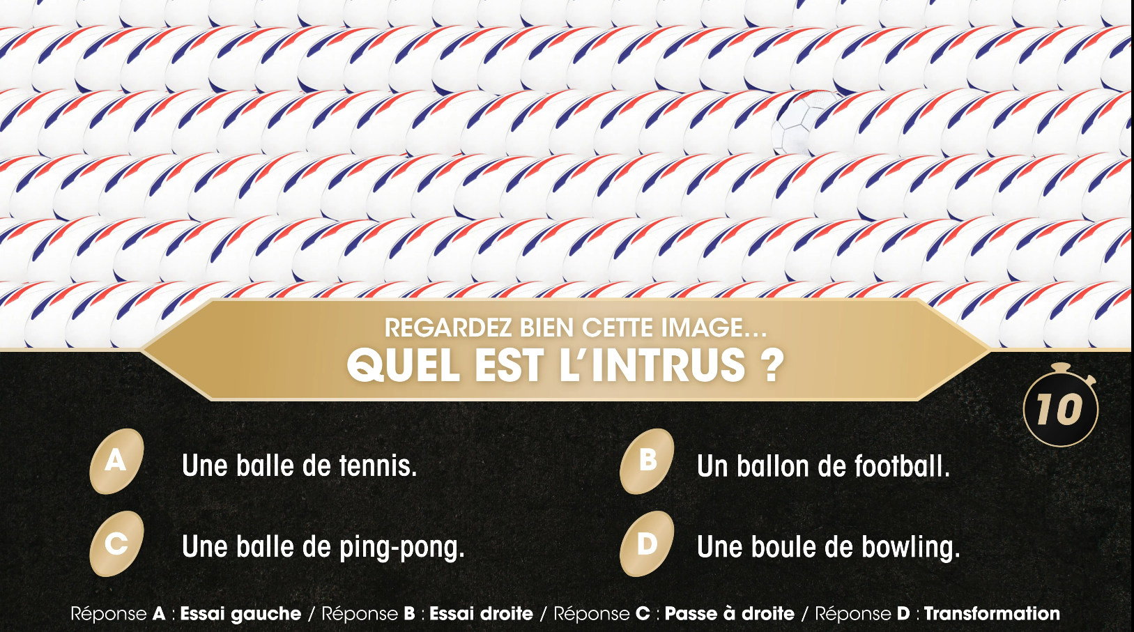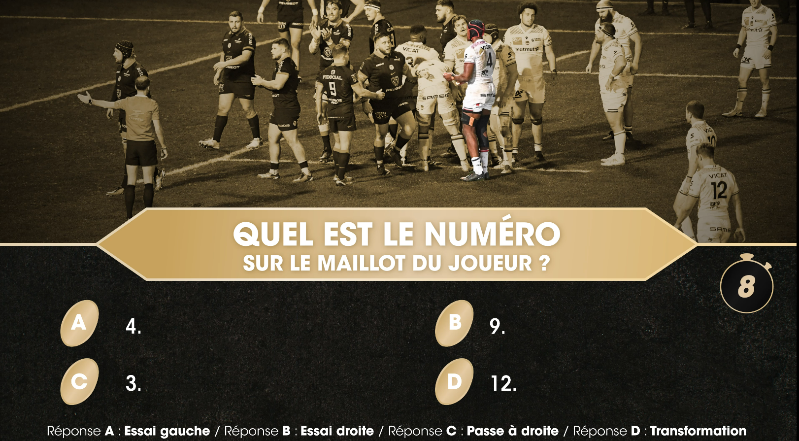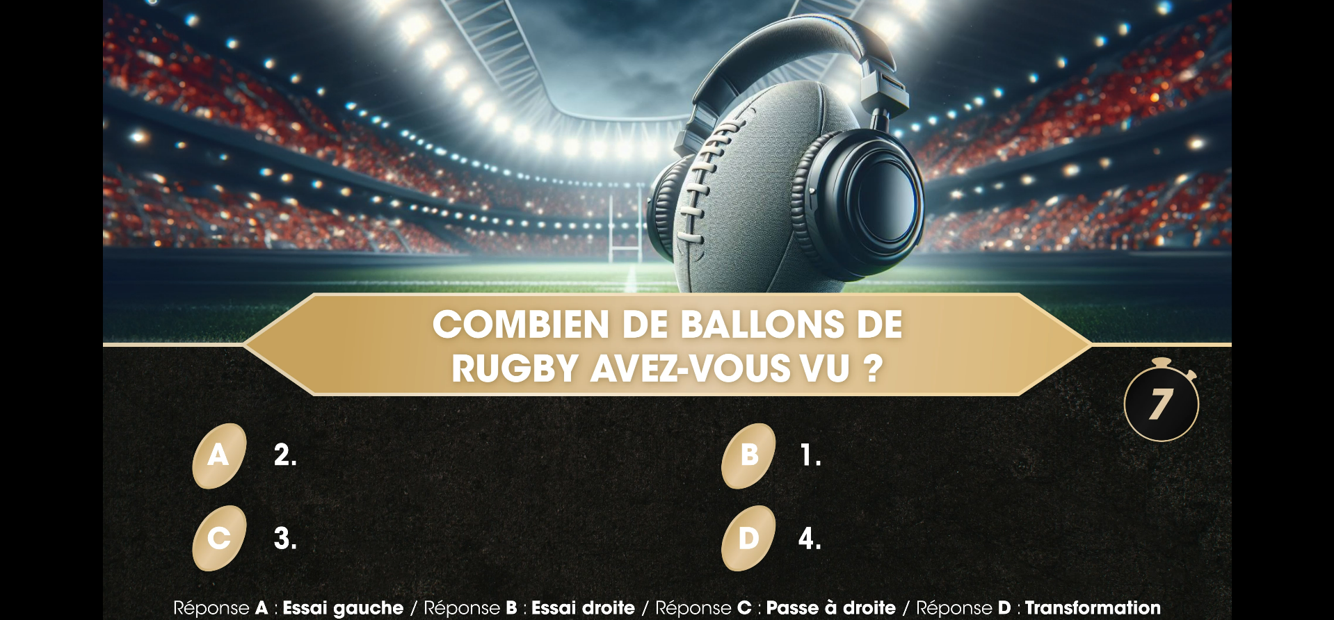 Un jeu oui ! mais pas n'importe lequel ! Un quizz ? trop simple. Une épreuve de dextérité ? Vu et revu. Et si nous mixions les deux ? Notre concept : simuler un terrain de rugby miniature sur lequel les joueurs doivent accomplir des actions rugbystiques pour répondre à des questions !